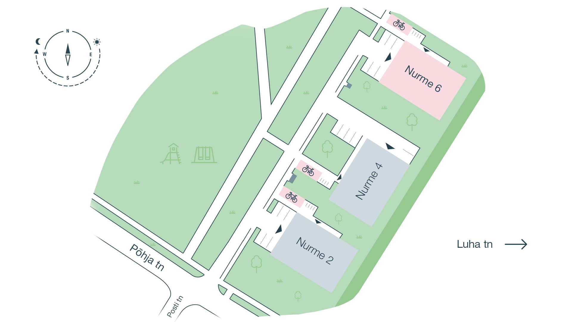 Nurme 6 elumaja kõrval on eraldi väike värviküllase haljaskatusega hoone panipaikadega, kus saad hoiustada jalgratast, lapsevankrit, tõukeratast või kelku. Hoone pikenduses on varjualune rattaparkla, et saaksid oma igapäevategemised võimalikult mugavalt rattaga aetud ja sinu külalistel oleks koht, kus oma jalgratast turvaliselt ning mugavalt parkida.