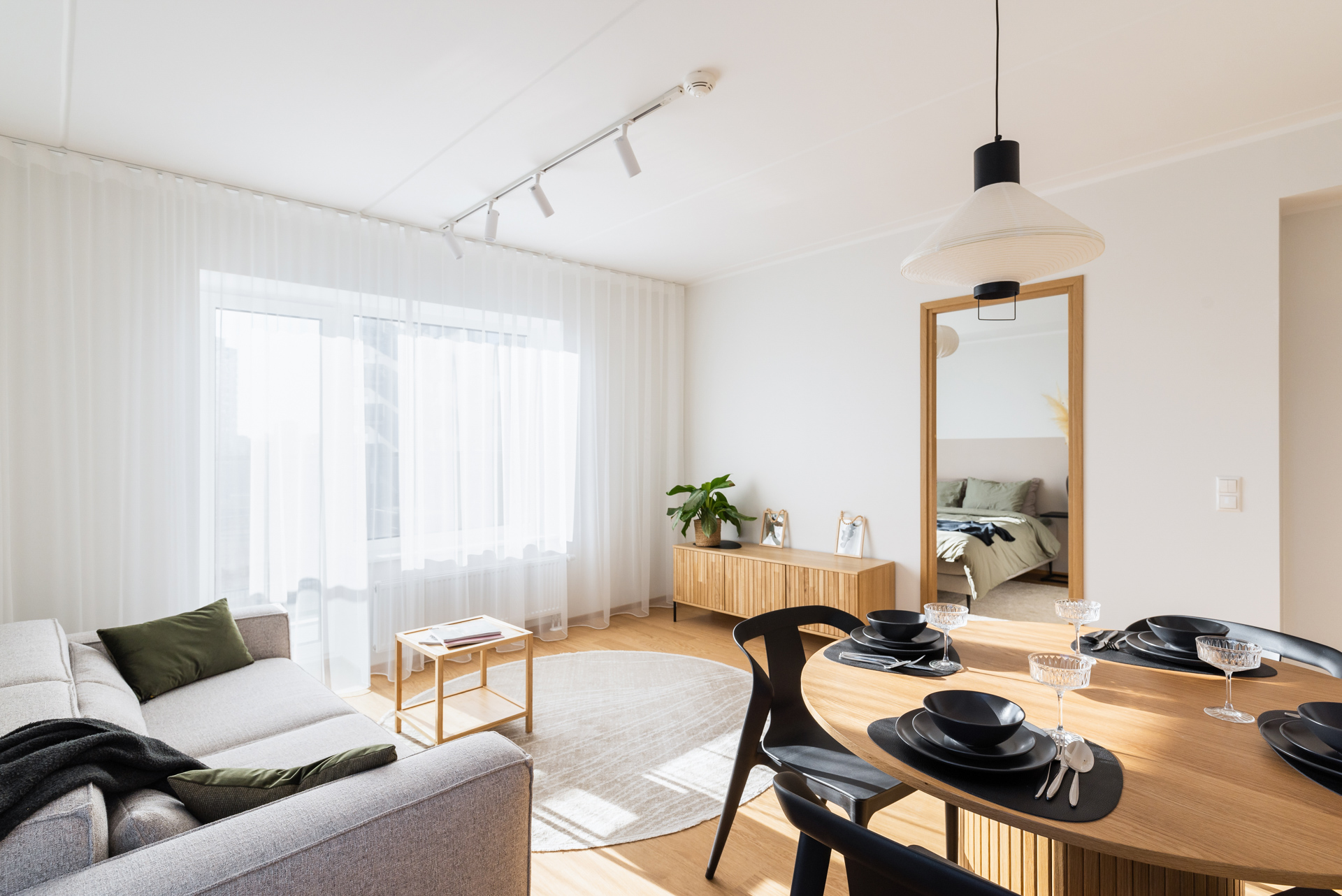 The floors in the dry areas of the apartments will be fitted with natural veneered parquet with veneered skirting boards in the same colour as the parquet and the floors in the sanitary rooms and the entrance will be tiled. The bathroom walls will be covered with ceramic tiles up to the suspended ceiling, and the walls of the rest of the apartment will be levelled and finished with a coat of paint. The apartment’s ceiling surfaces made of hollow core panels will be levelled and finished in white paint so that the joints between the panels remain visible, and the surfaces with technical communications under the ceiling will be fitted with plasterboard suspended ceilings finished in white paint.