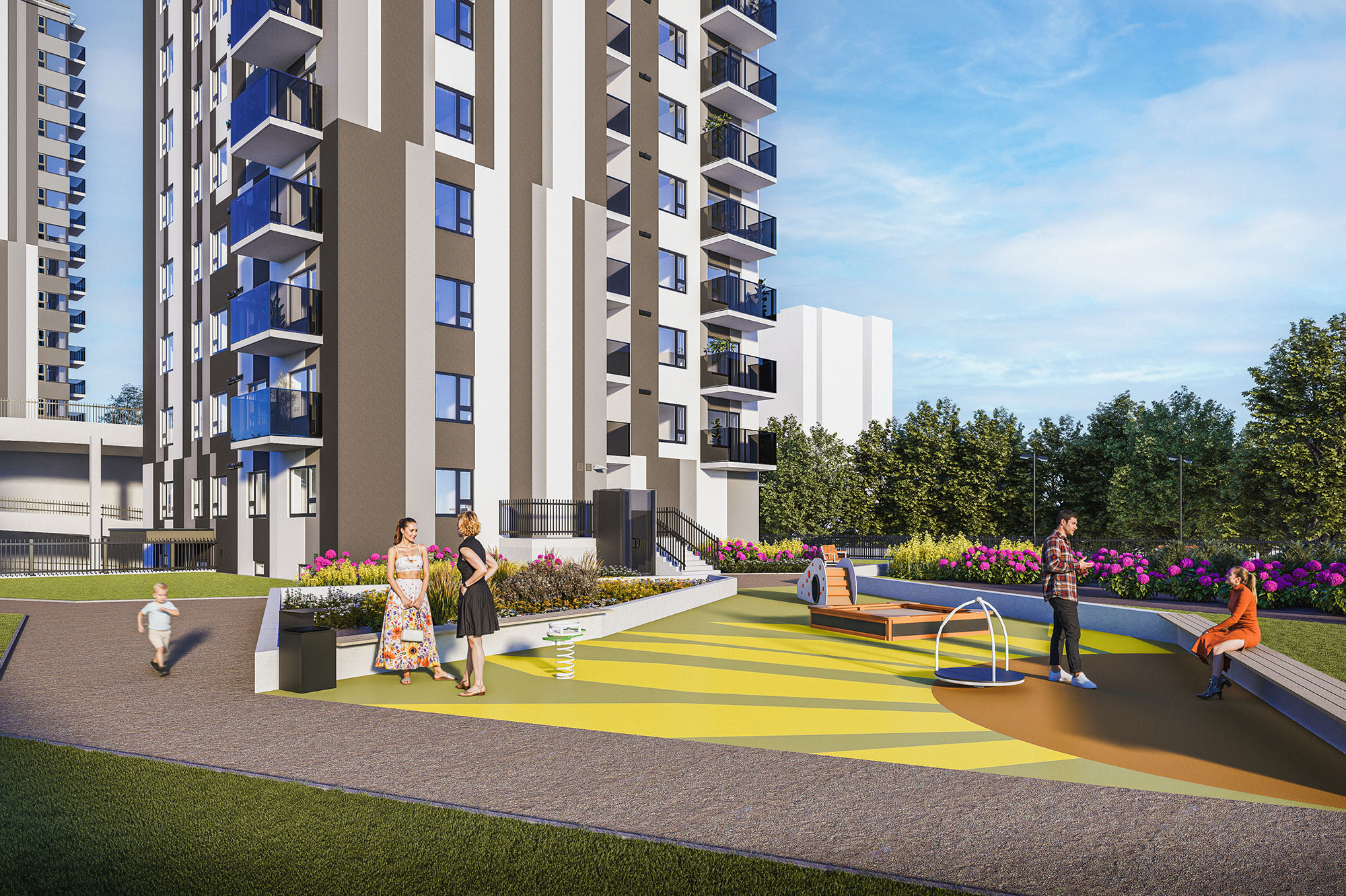 The pile foundation of the high-rise building will be built on monolithic reinforced concrete piles, which will be tied together with monolithic reinforced concrete pile caps. Load-bearing and inter-apartment walls will be assembled from reinforced concrete panels, and prefabricated reinforced concrete hollow core panels will be used as the load-bearing layer of the floor, which will be covered with a layer of insulation and a reinforced concrete cover slab. The plasterboard lightweight walls inside the apartments will be constructed of a metal frame and filled with insulation.