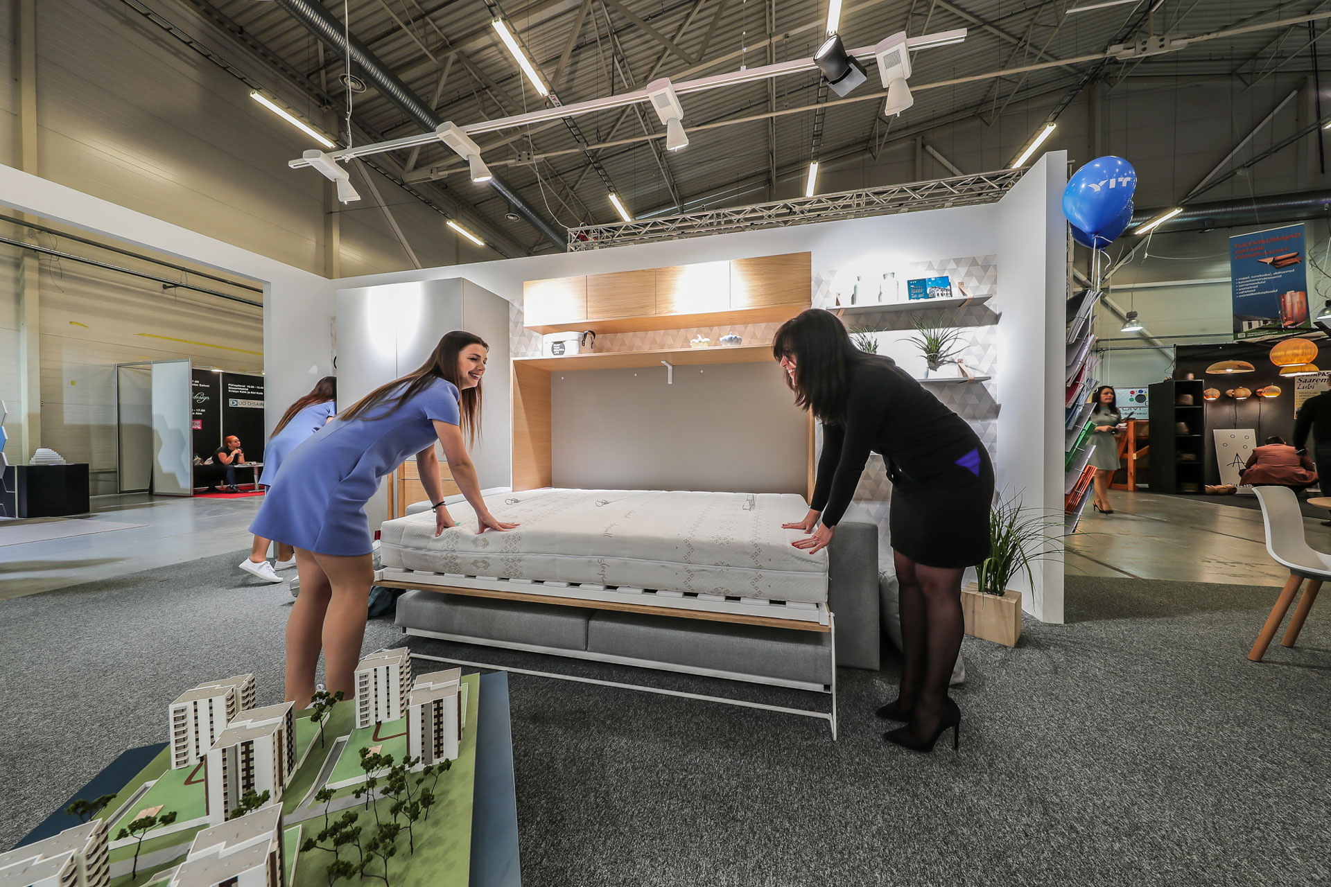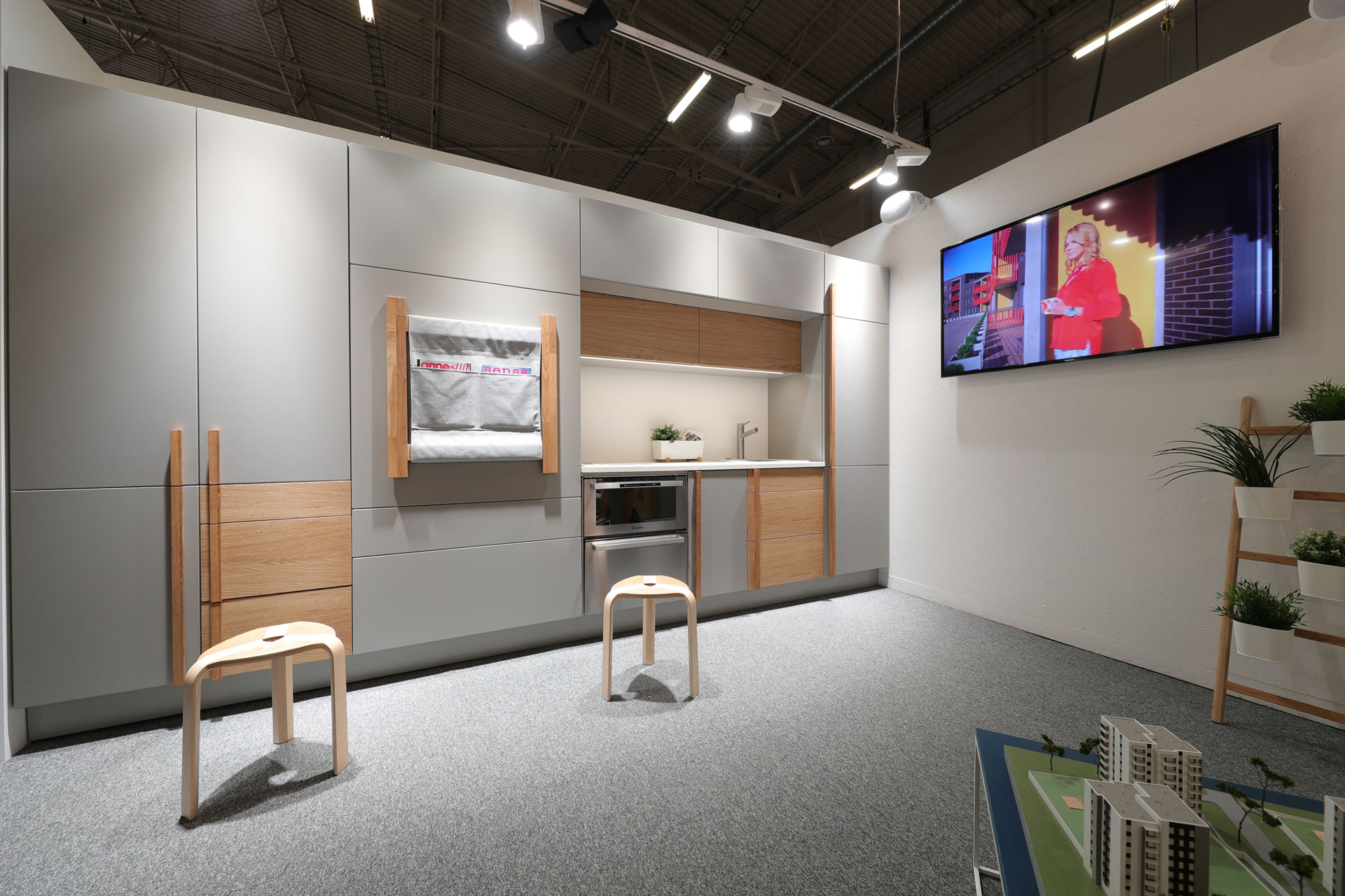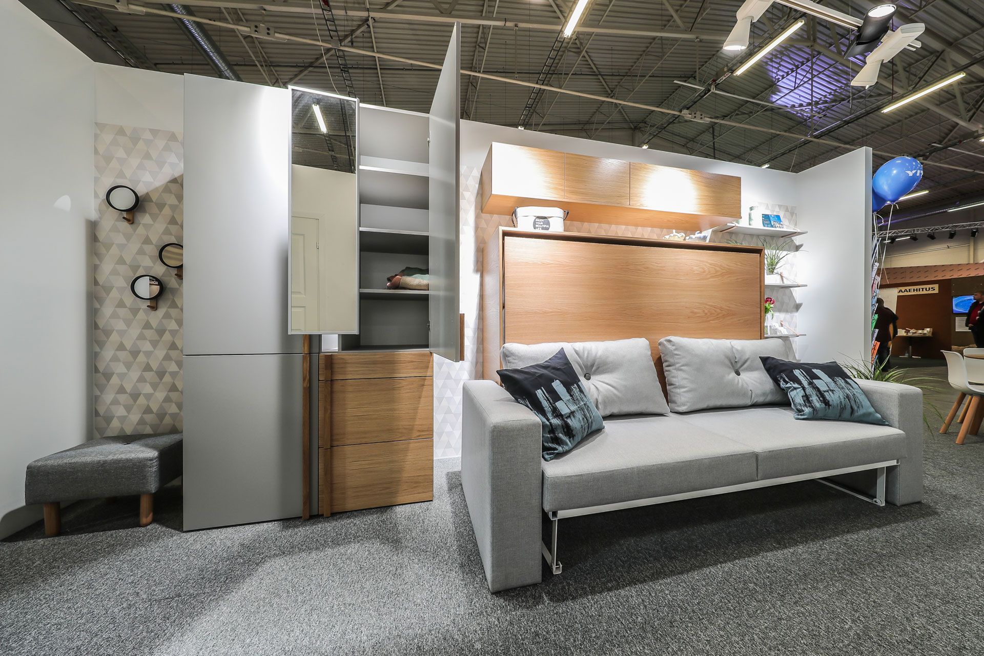 YIT Ehituse messistendis saab vaadata, kuidas kompaktses ühetoalises kodus mugav voodi, söögilaud ja muu vajalik ära mahutada ning samas kodu avara ja kaasaegsena hoida.