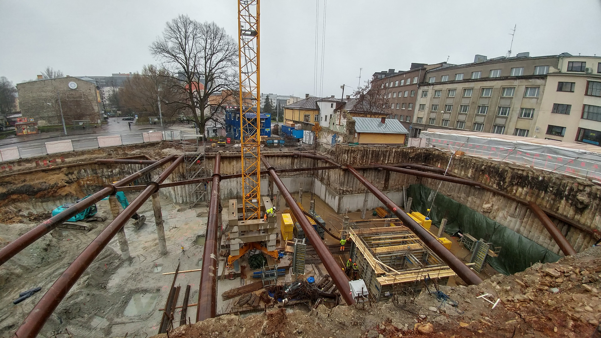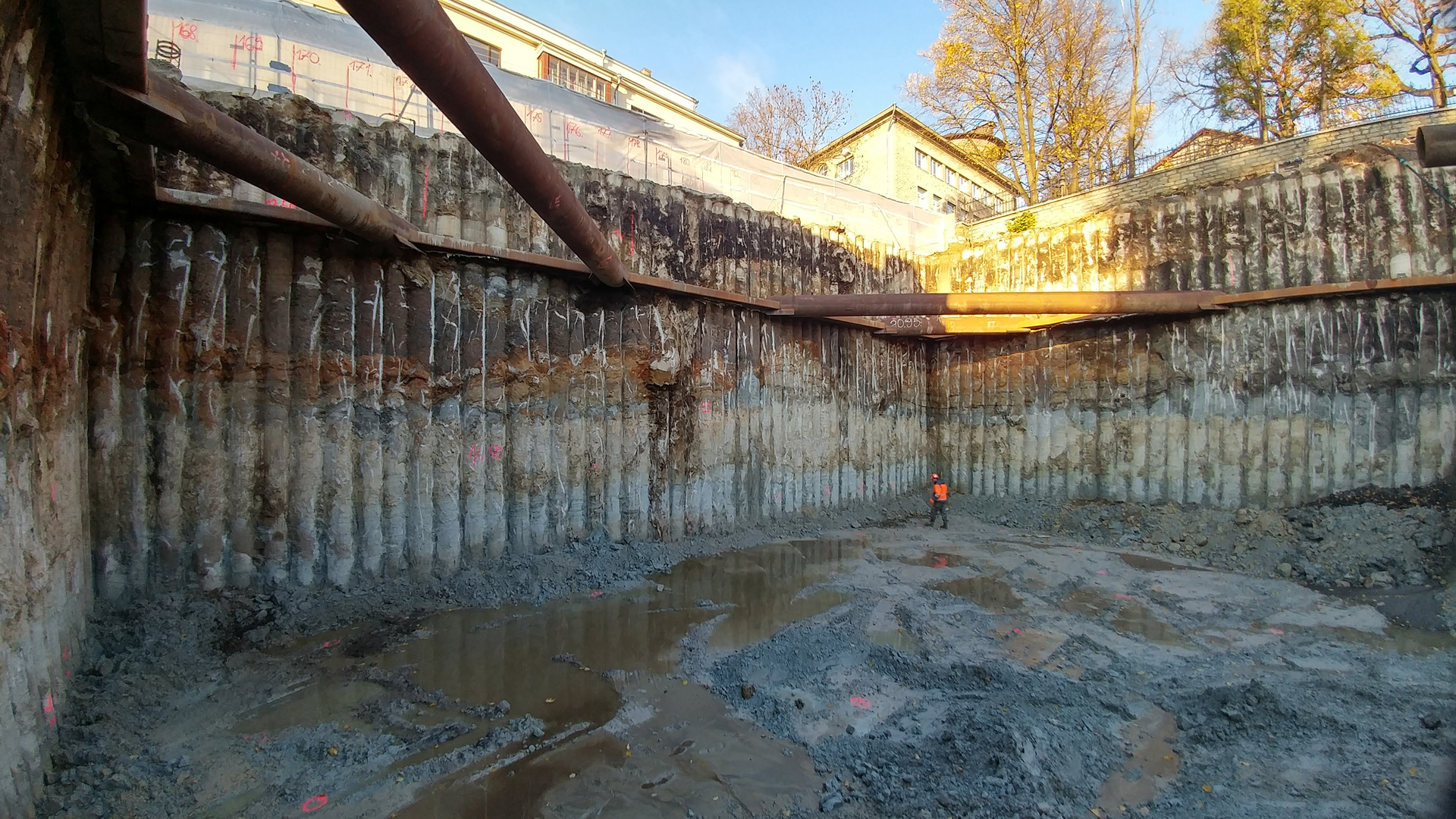Teimme asuin- ja liikerakennuksen rakennusmontun, johon rakensimme halkaisijaltaan d620 mm:n paaluseinän. Seinän syvyys oli 10–14 mm, kaivauksen syvyys jopa 12 m ja montusta kuljetettiin pois 22 000 m3 maata. Lisäksi tukiseinät tuettiin 30 m:n teräsputkilla.